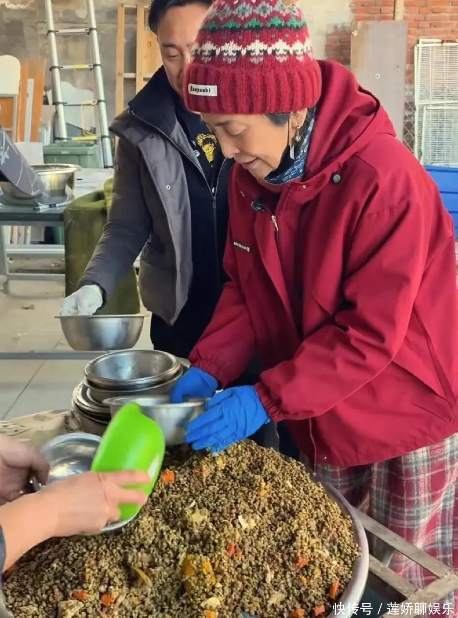 她从不是摆架子的明星,救助站的脏活累活全亲力亲为。每天会到基地打扫卫生、投喂狗粮,62岁的年纪还能轻松扛起50斤重的狗粮袋,丝毫不喊累。